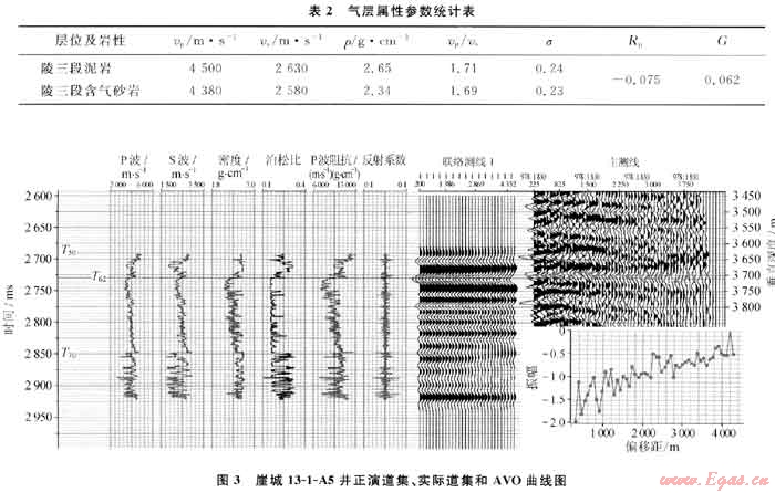 為了確定崖城13-1氣田陵三段的AV0類型,首先從理論出發(fā)統(tǒng)計(jì)了井上的氣層及上覆地層的屬性參數(shù),包括縱橫波速度、密度、泊松比等參數(shù),并通過Shuey’s的簡(jiǎn)化Zoeppritz方程計(jì)算了反射系數(shù),發(fā)現(xiàn)氣層頂面的反射系數(shù)大,而泊松比變化較小(表2),滿足產(chǎn)生第Ⅳ類異常的條件;接著選擇代表性的井(A5井)進(jìn)行了正演模擬,模擬結(jié)果顯示該井正演道集的氣層頂面均對(duì)應(yīng)波谷(負(fù)反射系數(shù)),并且隨著偏移距的增加振幅有減弱的跡象;隨后對(duì)實(shí)際的地震道集進(jìn)行了AV0分析(圖3),從實(shí)際道集中提取的氣層頂面AV0曲線表明:在偏移距200~4500m的變化范圍內(nèi),反射系數(shù)均為負(fù)值,并且其絕對(duì)值隨著偏移距的增多而減小,證實(shí)了該氣藏的Ⅳ類AV0特征。另外,在沒有鉆井的地方也對(duì)實(shí)際地震道集進(jìn)行了AV0分析,均顯示為Ⅳ類AV0特征。