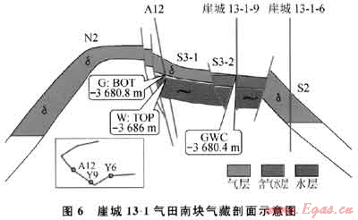 由于陵三段儲層厚,氣柱高度大,一直被認為是具統(tǒng)一氣水邊界的均一氣藏。但氣田范圍內(nèi)發(fā)育許多斷層,因斷距較小,斷層的封堵性常未引起重視。隨著十幾年的持續(xù)開發(fā),氣田的動靜儲量差別較大。在構(gòu)造南塊S3-1高部位的A12井,竟然在主力氣層出現(xiàn)水層,其氣水界面高出“統(tǒng)一”氣水界面276m,令所有研究者十分困惑。通過對該井壓力資料進行分析,A12井區(qū)北側(cè)斷層Y3隨著生產(chǎn)壓力下降而開啟,開井時地層壓力系數(shù)只有0.7。為進一步挖掘與S3-1相鄰的S3-2的儲量,又鉆了Y9井,結(jié)果更令人費解,只鉆遇薄氣層及厚水層,與S3-2東側(cè)低部位的Y6井矛盾,因為Y6井無水層。經(jīng)小層對比,儲層橫向變化不大且斷層并不能斷開儲層段。