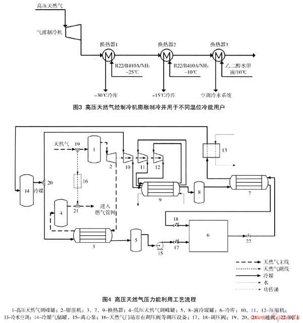 摘要:高壓管網(wǎng)輸送的天然氣在調(diào)壓過程中釋放巨大的壓力能,通過降壓設(shè)備將這部分能量有效回收,用于發(fā)電、天然氣脫水、輕烴分離、LNG及NGH調(diào)峰、橡膠粉碎和冷庫等領(lǐng)域。具體描述了聯(lián)合循環(huán)發(fā)電和回收壓力能所制得的冷能在冷庫中的運(yùn)用。針對天然氣供氣不平衡、調(diào)壓站分布不集中以及能量高效利用的問題,提出了改進(jìn)方案,充分利用膨脹機(jī)輸出的功驅(qū)動壓縮機(jī)等設(shè)備的運(yùn)轉(zhuǎn),將膨脹制得的冷量運(yùn)用在相應(yīng)的冷產(chǎn)業(yè)中,保證了壓力能的高效利用。