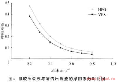 這種新型的溶液的結(jié)構(gòu)具有良好的可逆性,當(dāng)高剪切時,結(jié)構(gòu)解體;剪切速率降低后,結(jié)構(gòu)又重新恢復(fù)。采用自研環(huán)路實驗裝置測定的流動摩阻如圖4所示:在同等條件下VES壓裂液摩阻系數(shù)比胍膠壓裂液低,有利于降低施工摩阻減小施工壓力。