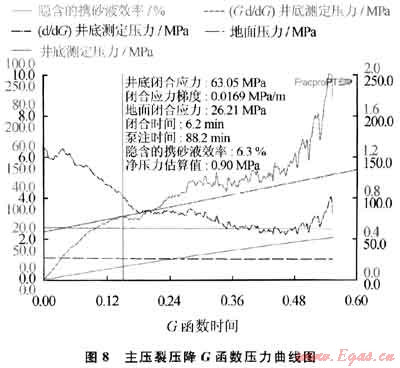 考慮該地區(qū)壓裂施工壓力普遍較高,故首先進(jìn)行測試壓裂。測試壓裂實際入井液量55m3。測試壓裂G函數(shù)分析曲線見圖7。對測試壓力分別進(jìn)行停泵壓力分析、壓降G函數(shù)分析和壓降雙對數(shù)分析以及平方根分析,井底閉合應(yīng)力梯度14.3kPa/m,閉合時間25.6min,凈壓力4.6MPa。施工排量5.Om3/min時清潔壓裂液體系摩阻僅為清水摩阻的1/3,說明清潔壓裂體系摩阻比常規(guī)胍膠體系要小。