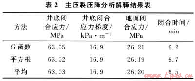 對主壓裂分別進(jìn)行停泵壓力分析、壓降G函數(shù)分析和壓降雙對數(shù)分析以及平方根分析,井底閉合應(yīng)力梯度為16.9kPa/m,地面閉合壓力為26.2MPa,閉合時間為6.5min(表2)。