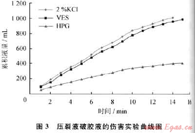 采用巖心流動實驗裝置評價該壓裂液對巖心的傷害,其狀況如圖3所示。胍膠壓裂液破膠液在通過API導(dǎo)流槽時,由于破膠液中存在殘渣,使累計體積隨時間的增長越來越慢,最后漸漸地趨向于零,傷害嚴(yán)重。而所研制的VES壓裂液破膠液通過API導(dǎo)流槽時,表現(xiàn)出了與2%KCl溶液相似的流動特性,該壓裂液對支撐裂縫帶的傷害非常小。