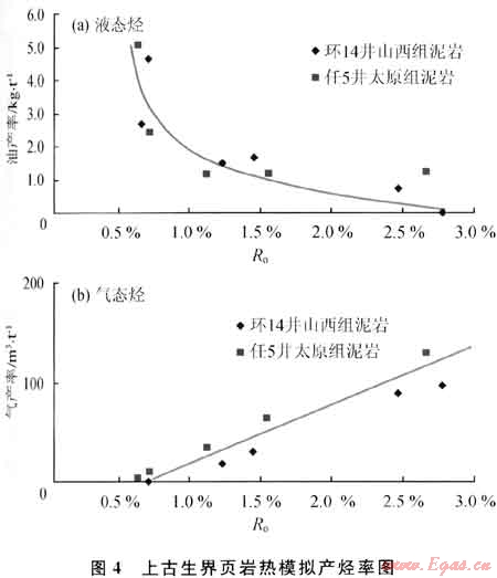 鄂爾多斯盆地環(huán)14井山西組頁巖和任5井太原組頁巖的熱模擬實(shí)驗(yàn)結(jié)果表明(圖4):Ro<0.7%時(shí),幾乎沒有氣態(tài)烴產(chǎn)出;Ro介于0.7%~1.1%時(shí),液態(tài)烴產(chǎn)率隨Ro增大迅速下降,而氣態(tài)烴產(chǎn)率則迅速增大,但產(chǎn)率數(shù)值還很?。籖o>1.1%時(shí),液態(tài)烴產(chǎn)率隨Ro增大緩慢下降,而氣態(tài)烴產(chǎn)率隨R,增大迅速增大;Ro為2.5%時(shí)的氣態(tài)烴產(chǎn)率達(dá)到110m3/t(有機(jī)碳)。從該區(qū)上古生界頁巖的Ro大都超過1.1%可見,上古生界頁巖以生成氣態(tài)烴為主,僅有少量液態(tài)烴。