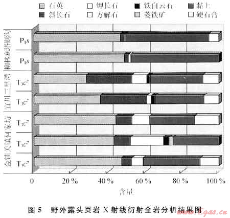 鄂爾多斯盆地下二疊統(tǒng)太原組、山西組和上三疊統(tǒng)長7段頁巖出露廣泛,厚度較大。其中太原組、山西組石英含量較高,為46.51%~54.04%;黏土含量偏高,為43.61%~47.81%。山西省呂梁市柳林縣成家莊鎮(zhèn)太原組黑色頁巖野外露頭樣品X射線衍射全巖分析結(jié)果顯示:石英含量為54.04%,斜長石含量為2.35%,黏土含量為43.61%。麻塔則溝下二疊統(tǒng)山西組中部黑色頁巖,石英含量為48.74%,斜長石含量為2.28%,鉀長石含量為1.17%,黏土含量為47.81%;底部石英含量為46.51%,斜長石含量為2.33%,菱鐵礦含量為0.81%,黏土含量為44.87%,硬石膏含量為5.48%(圖5)。