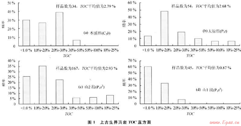 本溪組、太原組和山西組TOC較高(圖1),一般介于1.00%~5.O0%,其中本溪組TOC最高,峰值在2.00%~5.O0%。本溪組、太原組和山兩組二段3套頁巖TOC平均值分別為2.79%、2.68%和2.93%。