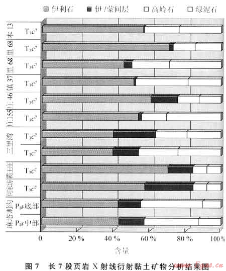長7段頁巖分布穩(wěn)定,可對(duì)比性強(qiáng)。巖心樣品X射線衍射黏土礦物分析結(jié)果顯示:伊利石含量為38.05%~66.10%,伊/蒙間層含量為1.O0%~25.00%,高嶺石含量為5.15%~27.03%,綠泥石含量為7.18%~32.37%(圖7)。巖心及野外露頭觀察表明,長7段頁巖外觀呈黑色,質(zhì)純,偶見介形蟲、魚類化石及星點(diǎn)狀黃鐵礦,并可見到泥包砂等深水沉積構(gòu)造,深湖-半深湖相沉積特征明顯。同時(shí),頁巖段中普遍夾有薄層凝灰?guī)r和砂質(zhì)頁巖,反映了湖盆的輕微震蕩和古氣候環(huán)境的變化。
