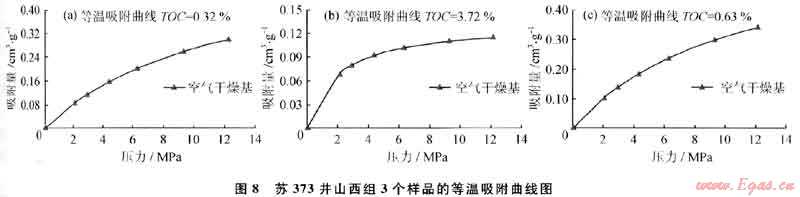 分析蘇373井3個(gè)樣品的等溫吸附曲線(圖8)可知:砂質(zhì)泥巖比碳質(zhì)泥巖的甲烷吸附能力強(qiáng),而同種巖性,TOC與甲烷吸附能力成正比,如T0C為0.6 3%的樣品在壓力為6MPa時(shí),甲烷吸附能力為0.23g/cm3,壓力增加到12MPa時(shí),甲烷吸附能力增至0.34g/cm3。