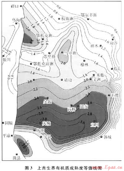 鄂爾多斯盆地上古生界地層的Ro集中在1.1%~2.5%,大部分處于高成熟階段,其Ro等值線圖顯示出(圖3),慶城-宜川一帶熱演化程度最高,Ro達(dá)到3.0%;烏審旗一帶Ro約為2.0%,鄂托克旗地區(qū)局部Ro最高達(dá)3.0%。除東北部杭錦旗 鄂爾多斯-府谷一線以外、東南部大荔向外、西南部固原以西等盆地邊緣地區(qū),上古生界地層絕大部分地區(qū)Ro均超過1.1%,達(dá)到了形成頁巖氣藏的成熟度標(biāo)準(zhǔn)。其中榆林地區(qū)Ro介于1.1%~2.5%,處于有利于生成頁巖氣的成熟度范圍內(nèi)。