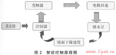 智能控制系統(tǒng)由地面部分和井下部分組成。通過采集井下壓力計(jì)或地面流量計(jì)信號(hào),根據(jù)煤層氣單井排采規(guī)律,地面人工預(yù)先設(shè)定井底流壓變化值,由智能控制系統(tǒng)自動(dòng)閉環(huán)控制排采系統(tǒng)的工作參數(shù)(電機(jī)轉(zhuǎn)速或頻率),實(shí)現(xiàn)了井底流壓的智能控制。其控制原理如圖2所示。