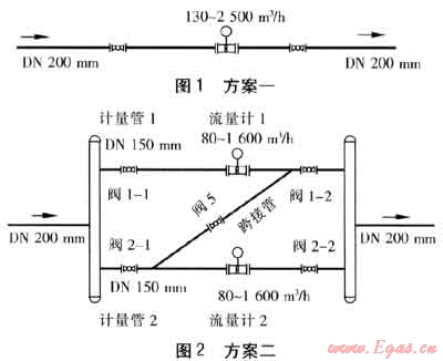 圖1、2為某城市天然氣門站計量系統(tǒng)工藝管路方案一和方案二。兩個方案相比較,方案一結構簡單,工程造價較低,方案二則相反。但是,采用兩管并聯(lián)的方案二,可以使整個計量系統(tǒng)的測量范圍從130~2500m3/h(量程比20:1)擴展到80~3200m3/h(量程比40:1)。在門站運行過程中,如果遇到流量波動較大時,方案二可以隨時打開或關閉兩臺流量計中的一臺,使流量計量儀表始終工作在0.2qmax到0.8qmax這一計量性能最優(yōu)的范圍段(qmax為最大流量),從而保證整個計量系統(tǒng)的計量性能最優(yōu)。另外在流量計1或流量計2中的某一臺出現(xiàn)故障或進行周期檢定時,可以使用單臺流量計供氣運行的方式,避免城市門站供氣中斷的情況發(fā)生。