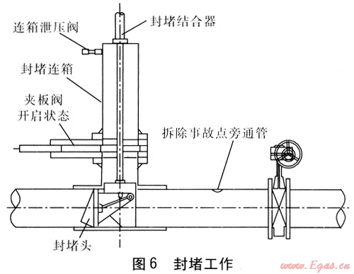 將封堵結(jié)合器、封堵頭、封堵連箱按所需規(guī)格選配組裝在一起,并測量計算出封堵就位時的各種數(shù)據(jù),確定封堵方向。把組裝好的封堵器安裝到夾板閥上(見圖5),先確定封堵方向無誤后,打開夾板閥,并關(guān)閉支線閥門,進(jìn)行封堵作業(yè)(見圖6)。封堵后,打開連箱泄壓閥對管道內(nèi)供熱介質(zhì)進(jìn)行放空,并確認(rèn)封堵的嚴(yán)密性。檢驗(yàn)完畢后,對事故點(diǎn)旁通管進(jìn)行拆除并采用鋼板焊接封堵。焊接完成后將封堵頭松開并提入封堵連箱內(nèi),關(guān)閉夾板閥,拆下封堵器,封堵作業(yè)結(jié)束。