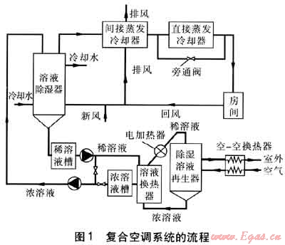 由于長江流域氣候潮濕,室外空氣濕球溫度較高,比焓、含濕量均大于室內(nèi)設計點,單獨使用蒸發(fā)冷卻技術無法得到理想的送風狀態(tài)參數(shù),需要將蒸發(fā)冷卻與除濕技術[2~4]聯(lián)合應用。因此,本文根據(jù)長江流域的氣候條件,構(gòu)建了蒸發(fā)冷卻與溶液除濕(采用內(nèi)冷型溶液除濕器及傳統(tǒng)的溶液再生方式)相結(jié)合的復合空調(diào)系統(tǒng),分析復合空調(diào)系統(tǒng)的流程。結(jié)合算例,對復合空調(diào)系統(tǒng)在長江流域應用的可行性和節(jié)能性進行探討。