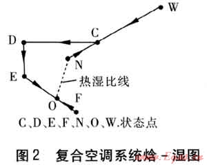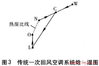 一次回風空調(diào)系統(tǒng)焓一濕圖見3。狀態(tài)W的室外新風與狀態(tài)N的室內(nèi)回風混合處理到狀態(tài)C,經(jīng)過表冷器冷卻除濕到狀態(tài)L(機器露點),然后經(jīng)過電加熱器加熱到送風狀態(tài)0送入房間,吸收房間余熱余濕,沿熱濕比線到狀態(tài)N。一次回風空調(diào)系統(tǒng)的主要缺點是:被處理空氣先冷卻后再熱,存在冷熱抵消問題;表冷器在濕工況下工作,需要溫度較低的冷源。