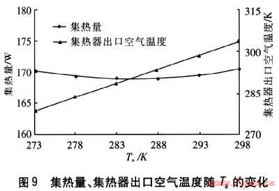 保持其他參數(shù)不變,集熱量、集熱器出口空氣溫度隨Ta的變化見(jiàn)圖9。由圖9可知,Ta增大,即集熱器進(jìn)口空氣溫度增大,則集熱器出口空氣溫度相應(yīng)升高。