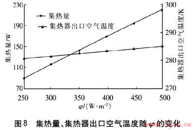 保持其他參數(shù)不變,集熱量、集熱器出口空氣溫度隨φ的變化見(jiàn)圖8。由圖8可知,隨著φ的增大,吸熱板溫度升高,與流道內(nèi)空氣的溫差加大,對(duì)流傳熱增強(qiáng),集熱器出口空氣溫度升高,集熱量也隨之升高。