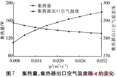 保持其他參數(shù)不變,集熱量、集熱器出口空氣溫度隨q的變化見(jiàn)圖7。由圖7可知,隨著q的增大,集熱器出口空氣溫度降低,這是由于q的增大易導(dǎo)致空氣穿過(guò)吸熱板的時(shí)間和在集熱器內(nèi)部流動(dòng)的時(shí)間縮短,影響了換熱效果。然而,集熱量一方面取決于集熱器出口空氣溫度與環(huán)境溫度之差,另一方面取決于q。由圖7可知,當(dāng)q增大時(shí),集熱器出口空氣溫度降低幅度較小,此時(shí)q成為影響集熱量的決定因素。因此隨q的增大,集熱量逐漸升高。但在集熱器出口空氣溫度逐漸減小的影響下,集熱量的增長(zhǎng)速率是逐漸減緩的。
