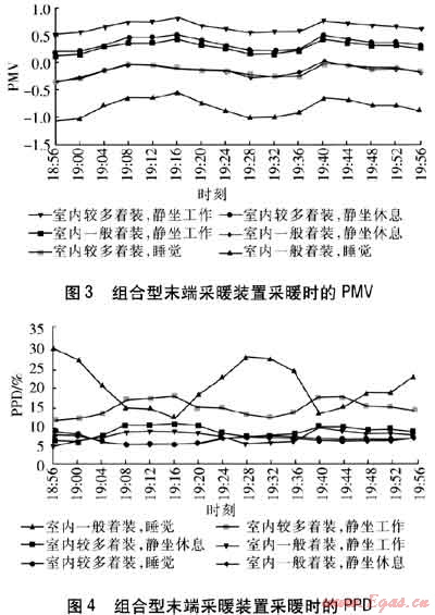 在實(shí)驗(yàn)室1中,采用組合型末端采暖裝置進(jìn)行采暖,開啟供暖型風(fēng)機(jī)盤管的風(fēng)機(jī)中檔后進(jìn)行測(cè)試。當(dāng)CLO=1.0時(shí),當(dāng)人員靜坐休息時(shí),PMV的平均值為0.31,PPD的平均值為7.26%,滿足IS0 7730—2005對(duì)可接受熱環(huán)境的規(guī)定,即室內(nèi)熱環(huán)境滿足大部分人的舒適要求。靜坐工作時(shí),PMV的平均值為0.63,PPD的平均值為13.38%,人們需將較多著裝變?yōu)橐话阒b(CLO=0.7)。變?yōu)橐话阒b后,靜坐工作時(shí)PMV的平均值為0.28,PPD的平均值為6.87%;靜坐休息時(shí)PMV的平均值為-0.04,PPD的平均值為5.20%。此時(shí)靜坐工作和靜坐休息時(shí)的熱環(huán)境均符合IS0 7730—2005對(duì)可接受熱環(huán)境的規(guī)定??梢姴捎媒M合型末端采暖裝置采暖,既符合人們的日常行為習(xí)慣,又提升了人們的生活品質(zhì)。通過對(duì)幾年實(shí)測(cè)數(shù)據(jù)的分析,建議采用組合型末端采暖裝置時(shí),在進(jìn)行維持基礎(chǔ)室溫所需的散熱器面積計(jì)算時(shí),散熱器的散熱量宜取該房間室內(nèi)采暖設(shè)計(jì)熱負(fù)荷的40%。組合型末端采暖裝置采暖時(shí)的PMV、PPD分別見圖3、4。