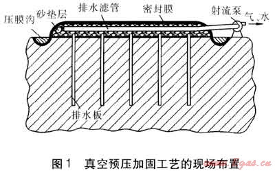 在采用真空預(yù)壓加固軟土地基時(shí),在密封膜上不施加重物,而把大氣作為荷載。在抽氣時(shí),土體孔隙中的氣體首先被抽出,使密封膜緊貼于砂墊層上。砂墊層中形成的負(fù)壓,通過排水板逐漸向下延伸,并由排水板向其周圍土體傳遞,引起土體中孔隙水壓力降低,從而使土體孔隙中的水由土體向排水板滲流,最后匯至砂墊層中被射流泵排出。淺層真空預(yù)壓加固與深層真空預(yù)壓加固工藝的主要區(qū)別在于,前者采用編織布、無紡?fù)凉げ嫉忍娲皦|層,以及排水濾管的布置方式不同。真空預(yù)壓加固工藝的現(xiàn)場布置見圖1。