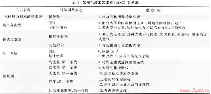 采用HAZOP法對某輸氣站的工藝流程進行了全面的危險辨識,將該站的工藝流程劃分為8個分析節(jié)點,共考慮了78個偏差,形成了13條建議(表3)、24項跟蹤任務[6]。