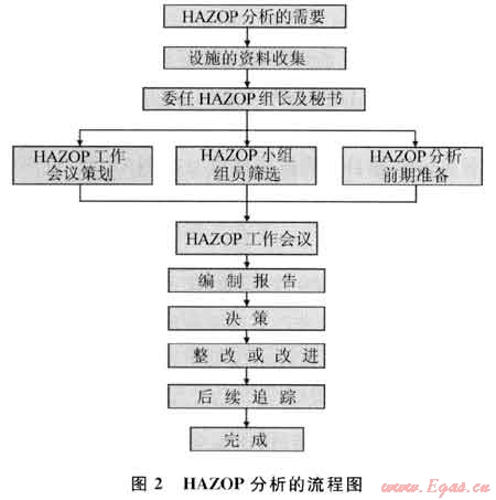 HAZOP法分析的目的是識別工藝或者操作過程中存在的危害,識別不可接受的風險狀況。根據(jù)多年來的統(tǒng)計分析,HAZOP可以減少29%設計原因的事故和6%操作原因的事故,比安全檢查表、可靠性檢查等分析技術更為有效[2~3]。HAZOP方法明顯不同于其他分析方法,它是一個系統(tǒng)工程(圖1),必須由不同專業(yè)組成的分析組來完成,這種群體方式的主要優(yōu)點在于能相互促進、開拓思路。