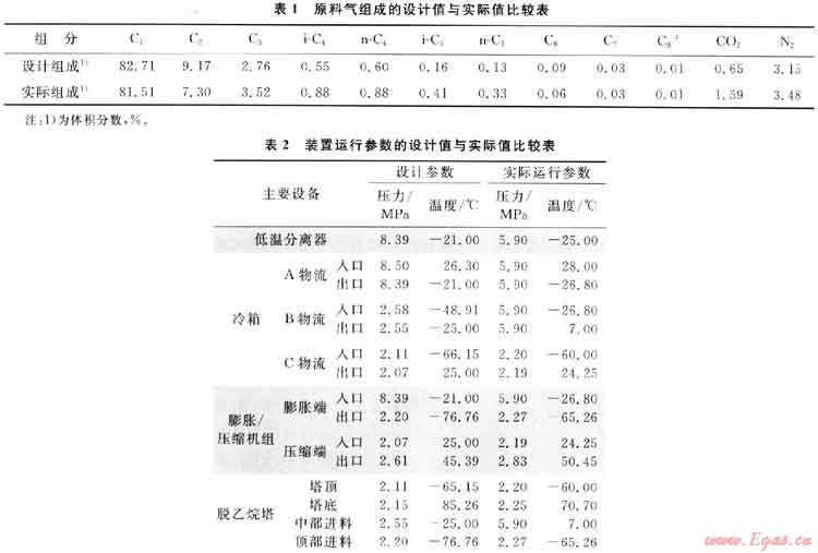對比凝析氣處理裝置的天然氣的組成及裝置運行參數(shù)的設計值與實際值,可知原料氣的組成有所變化,天然氣變富,天然氣的處理量明顯增加,進氣壓力降低且生產裝置的運行參數(shù)也與設計參數(shù)有一定偏差。