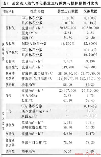 依據(jù)該含硫天然氣凈化裝置的運(yùn)行數(shù)據(jù),將原料氣及MDEA吸收溶液的參數(shù)輸入凈化裝置工藝模型,調(diào)整模型參數(shù),使輸出干氣氣質(zhì)達(dá)到凈化氣氣質(zhì)標(biāo)準(zhǔn)。表2為某含硫天然氣凈化裝置運(yùn)行數(shù)據(jù)與模擬數(shù)據(jù)對比表,據(jù)此來驗(yàn)證所建立的凈化裝置模型的準(zhǔn)確性。