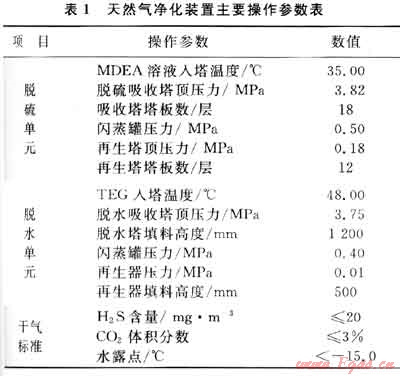 川渝地區(qū)某50×104m3/d天然氣凈化裝置采用典型的甲基二乙醇胺(MDEA)溶液吸收法脫除原料氣中的酸氣(主要為H2S和C02)成分,用三甘醇(TEG)溶液吸收法脫除水分,降低天然氣的露點(diǎn)。原料氣的組成為:CH4體積分?jǐn)?shù)為95.100%,C2H6體積分?jǐn)?shù)為2.122%,C3H8體積分?jǐn)?shù)為0.431%,C4H10體積分?jǐn)?shù)為0.123%,C5H12體積分?jǐn)?shù)為0.032%,C02體積分?jǐn)?shù)為0.180%,H2S體積分?jǐn)?shù)為1.900%,N2體積分?jǐn)?shù)為0.112%,H2O為飽和狀態(tài)。圖1為該天然氣凈化裝置的工藝流程簡圖。表1為該天然氣凈化裝置的主要操作參數(shù)及干氣質(zhì)量標(biāo)準(zhǔn)。