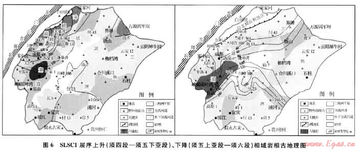 SLSC2層序基準(zhǔn)面下降期對(duì)應(yīng)須五上亞段及須六段沉積期,該時(shí)期屬于龍門山活動(dòng)相對(duì)寧?kù)o期,古地形相對(duì)變緩,沉積體系演變?yōu)橐匀侵?淺湖沉積為主,須五段早期的辮狀河三角洲向曲流河三角洲演變,湖盆中心位于彭山-射洪一線,呈北東向展布,明顯受古龍門山控制。三角洲前端淺湖砂壩及河口壩較湖盆擴(kuò)張期規(guī)模亦明顯變小,主要由龍門山前緣川西坳陷北段安縣-中壩地區(qū),米倉(cāng)山-大巴山前萬(wàn)源-宣漢、川東南川-重慶、川南宜賓-威遠(yuǎn)地區(qū)提供物源并發(fā)育規(guī)模相對(duì)較小的三角洲沉積。受晚印支運(yùn)動(dòng)影響,盆地北部安縣-劍閣一帶須五段沉積后隆升剝蝕缺失,須六段無(wú)沉積。