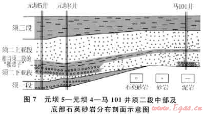 近年來(lái)在元壩、馬路背地區(qū)、九龍山地區(qū)及金華地區(qū)等須二段中鉆井揭示了石英砂巖(圖7),反映出須出須二段沉積期川中西部及川北地區(qū)存在與外海連通的水道,局部時(shí)期有海侵影響。