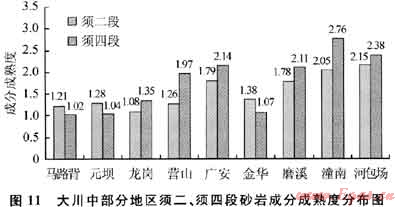 川中地區(qū)須家河組各砂層段厚度基本一致,砂巖百分比較高,一般介于70%~90%。經(jīng)巖礦鑒定,黏土雜基含量一般低于5%,淘洗干凈。除正粒序構(gòu)造砂層上部和逆粒序砂層底部可以有厚度不大的粉細(xì)粒巖屑砂巖外,主要為中粒、中粗粒巖屑石英砂巖或長(zhǎng)石巖屑砂巖。巖屑多為硅質(zhì)巖屑、石英巖巖屑及花崗巖巖屑等硬質(zhì)巖屑,成分成熟度介于1.02~2.76(圖11)。在營(yíng)山以北、河包場(chǎng)以東區(qū)域須四、須六段軟質(zhì)巖屑明顯增加、雜基含量增多,須二段除川北元壩、九龍山地區(qū)部分層段雜基含量較高及碳酸鹽巖巖屑增多外,普遍淘洗干凈,且在九龍山、元壩、馬路背及金華地區(qū)須二段“腰帶子”泥巖之下局部可見(jiàn)石英砂巖,表明須二段湖盆范圍較須四、須六段的范圍大,且局部有海侵影響。