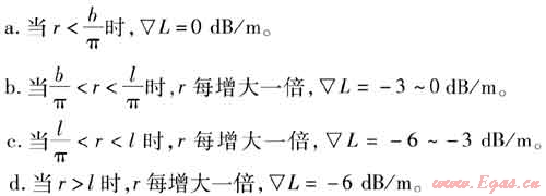面聲源隨傳播距離增加產(chǎn)生的聲壓級(jí)衰減值與面聲源形狀有關(guān)。如某鍋爐房的風(fēng)機(jī)房,設(shè)風(fēng)機(jī)房長(zhǎng)為f,寬為b,隨著傳播距離r的增加,聲壓級(jí)衰減梯度▽L與r的關(guān)系為: