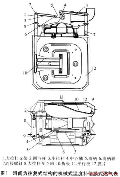 市場上的機(jī)械式溫度補(bǔ)償膜式燃?xì)獗碛袃煞N:一種是滑閥為往復(fù)式結(jié)構(gòu),另一種是滑閥為旋轉(zhuǎn)式結(jié)構(gòu)。