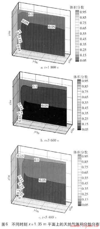 模擬了天然氣泄漏后,x=1.35m平面、z=1m(距離地面1m)平面、z=1.6m平面上的天然氣體積分數(shù)隨時間t的變化規(guī)律。天然氣泄漏1800、3600、5400s后x=1.35m平面上的天然氣體積分數(shù)分布見圖6。由模擬結(jié)果可知,天然氣泄漏擴散后的體積分數(shù)隨與地面垂直距離的增大而增大。不同時刻天然氣泄漏擴散的形態(tài)基本相似,但天然氣的體積分數(shù)和所覆蓋的危險區(qū)域變化較大。