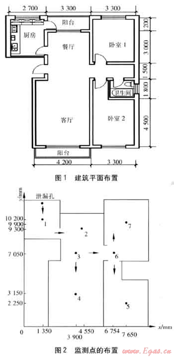 以該二室一廳建筑內(nèi)的廚房天然氣泄漏為例,建筑平面布置見圖1,尺寸單位為mm,房間高3.3m。按照該建筑建立物理模型,天然氣泄漏點設(shè)定在廚房地表面,在室內(nèi)設(shè)置7個監(jiān)測點,監(jiān)測點的布置見圖2,監(jiān)測點距地面1.6m,圖2中的箭頭表示天然氣泄漏后的擴散方向。設(shè)室內(nèi)環(huán)境溫度為27℃,壓力為一個標準大氣壓,墻壁為絕熱,房間處于封閉狀態(tài)。假定天然氣泄漏孔的直徑為25mm,泄漏速度為3m/s。