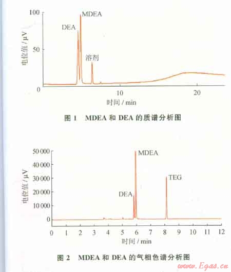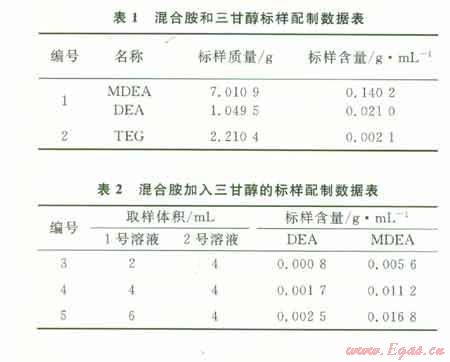 2)待測(cè)樣品中加入同樣量的TEG做參比,經(jīng)色譜分析后,求出樣品中DEA、MDEA與TEG色譜峰面積的比值,代入上述線性方程中即可求得待測(cè)樣品中DEA、MDEA的含量。