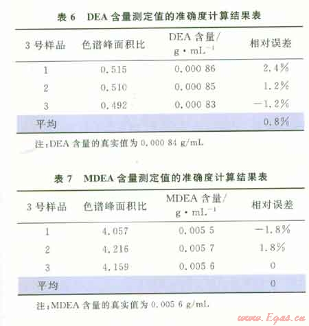 用3號(hào)樣品重新進(jìn)樣3次,根據(jù)分析結(jié)果計(jì)算DEA、MDEA含量測(cè)定值的準(zhǔn)確度,結(jié)果如表6、7所示。