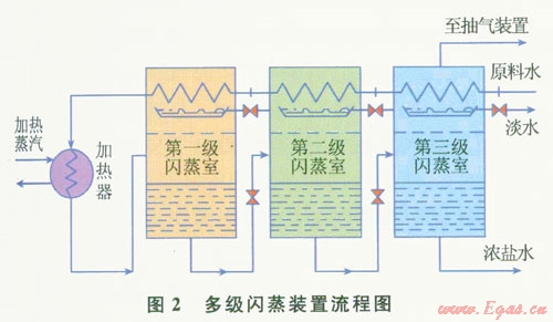 煤層氣產(chǎn)出水蒸餾脫鹽處理裝置的基本原理就是加熱煤層氣產(chǎn)出水,使之產(chǎn)生大量蒸汽并進行氣液分離。同時,利用原料水為分離出的蒸汽進行冷卻。