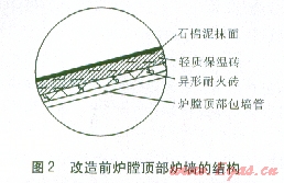 在運(yùn)行過(guò)程中,由于高爐煤氣的產(chǎn)量不穩(wěn)定,壓力較低,燃燒器出現(xiàn)數(shù)次熄火。不久,現(xiàn)場(chǎng)運(yùn)行人員在爐膛頂部爐墻發(fā)現(xiàn)幾處裂縫。現(xiàn)場(chǎng)檢查后發(fā)現(xiàn),爐膛頂部的包墻管為單根光管結(jié)構(gòu),耐火層采用異形耐火磚敷設(shè),絕熱層采用輕質(zhì)保溫磚,最外層用石棉泥抹面密封,改造前爐膛頂部爐墻的結(jié)構(gòu)見(jiàn)圖2。
