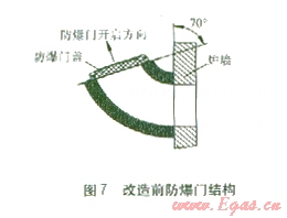 改造前后的防爆門(mén)結(jié)構(gòu)分別見(jiàn)圖7、8。改造前防爆門(mén)蓋與豎直爐墻的夾角為70°。由力學(xué)分析可知,防爆門(mén)蓋與豎直爐墻的夾角越大,需要的開(kāi)啟力量就越大[3]。改造前防爆門(mén)蓋與豎直爐墻的夾角為70°,防爆門(mén)開(kāi)啟需要的力很大。為解決防爆門(mén)開(kāi)啟力大的問(wèn)題,對(duì)原有防爆門(mén)進(jìn)行改造,改造后防爆門(mén)蓋與豎直爐墻的夾角變?yōu)?0°,這樣防爆門(mén)需要的開(kāi)啟力就減小很多,爐內(nèi)壓力突然升高時(shí)可以迅速開(kāi)啟泄壓,有效地防止?fàn)t內(nèi)壓力突然升高對(duì)尾部煙道頂部爐墻造成破壞。