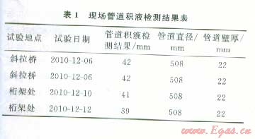 現(xiàn)場(chǎng)管道積液檢測(cè)結(jié)果如表l所示。