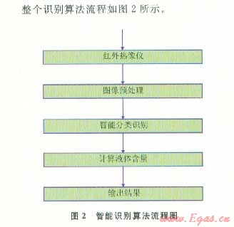 紅外熱像儀采集的圖像首先使用圖像預(yù)處理算法(包括中值濾波、目標(biāo)分割等)將圖像中的噪聲和背景信息去掉。被預(yù)處理后的圖像只保留了含有溫度梯度變化的部分目標(biāo)圖像。使用智能識(shí)別算法對(duì)圖像進(jìn)行識(shí)別,計(jì)算出液體的含量。