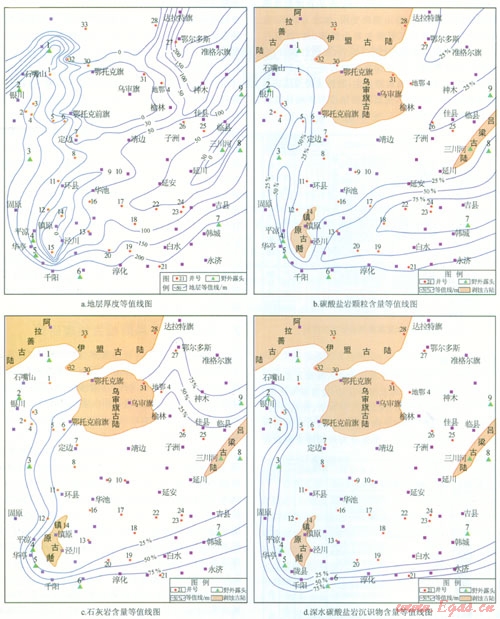 本文中深水碳酸鹽巖沉積物主要指深灰、灰黑色泥灰?guī)r、含泥灰?guī)r及泥晶灰?guī)r,其顏色較深,顆粒細(xì)小,代表較深水沉積環(huán)境。通過50余口鉆井及10條野外露頭剖面統(tǒng)計,繪制了鄂爾多斯盆地深水碳酸鹽巖沉積物含量分布圖(圖3一d),其含量大于50%的主要分布在銀川-固原-千陽-淳化-永濟一線外圍,多超盆地范圍,盆地內(nèi)深水碳酸鹽巖沉積物含量基本小于25%。