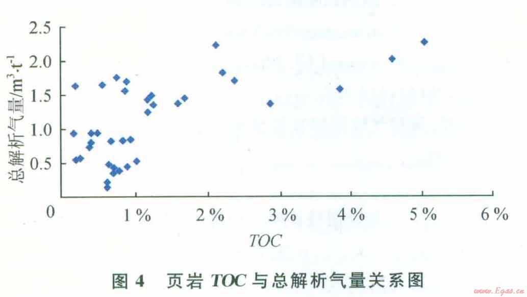 2)該頁(yè)巖氣藏的TOC介于0.01%~5%,該頁(yè)巖氣藏是具有潛力的烴源巖;R0值范圍為2.75%~3.92%,處于過(guò)成熟范圍,會(huì)影響頁(yè)巖氣體的吸附量;頁(yè)巖氣藏的孔隙度與總解析氣量并沒(méi)有明顯的關(guān)系,頁(yè)巖的總解析氣量與TOC存在著明顯的正相關(guān)的