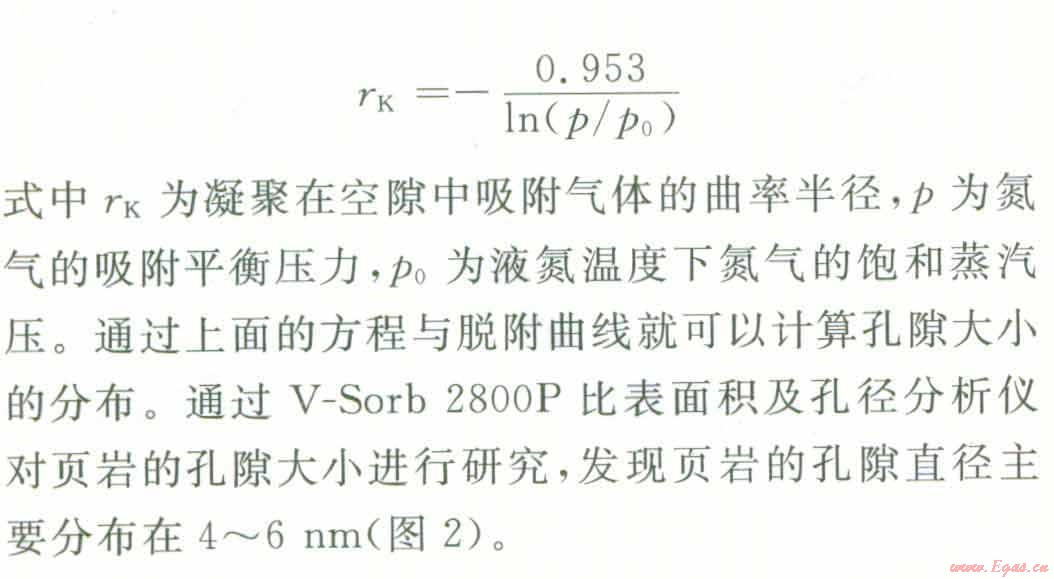 孔隙按大小可分為大孔(直徑大于50 nm),介孔(直徑介于2~50 rim)、微孑L(直徑小于2 nm)。利用氣體在頁(yè)巖孑L隙中的吸附與解吸可以測(cè)量其孔隙大小及其分布情況,當(dāng)壓力低于氣體的臨界壓力時(shí),對(duì)于介孔與大孔,首先發(fā)生多層吸附,相對(duì)壓力更高時(shí),則發(fā)牛毛細(xì)管凝聚,形成類似液體的彎液面。介孔孔徑分布一般用Kelvin方程進(jìn)行計(jì)算。以氮?dú)庾鳛槲綒怏w時(shí),當(dāng)液氮溫度為77 K時(shí),Kelvin方程可表述如下: