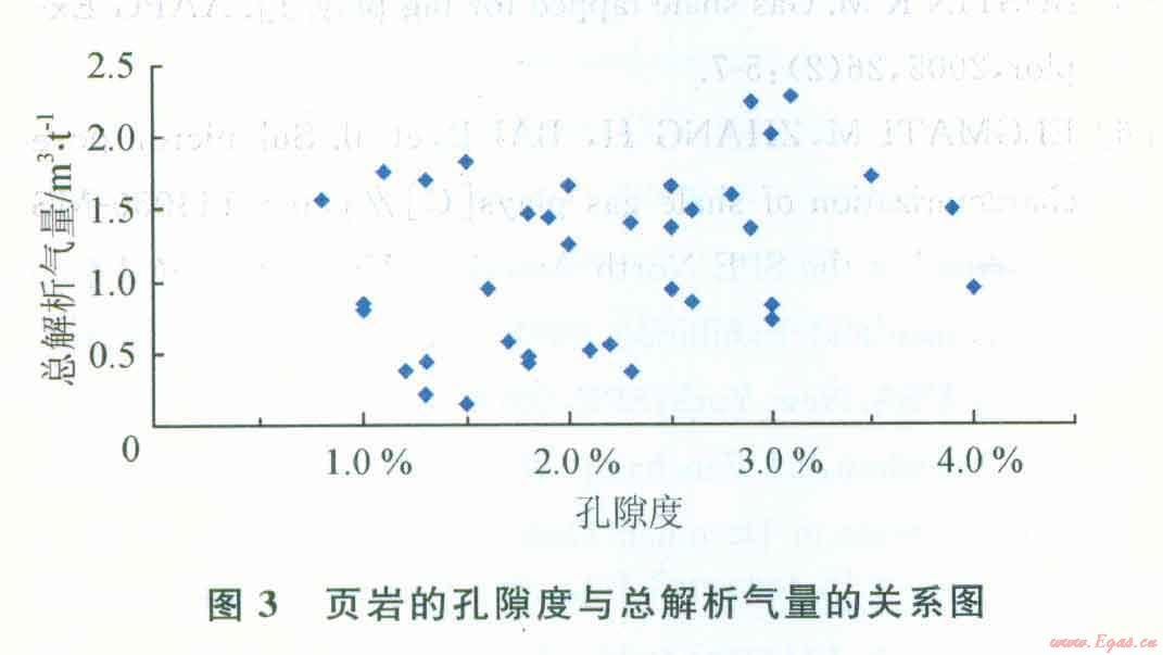 圖3是頁(yè)巖氣的總解析氣量與頁(yè)巖的孔隙度的關(guān)系圖,從圖中可以看到該頁(yè)巖氣藏的孔隙度與總解析氣量并沒(méi)有明顯關(guān)系。圖4是頁(yè)巖的總解析氣量與TOC關(guān)系圖,從圖中可以看到兩者存在著明顯的正相關(guān)關(guān)系,隨著頁(yè)巖的有機(jī)質(zhì)含量的增加,頁(yè)巖的總解析氣量也是增加的。美國(guó)5大頁(yè)巖具有豐富的有機(jī)質(zhì)含量,其TOC大多介于l.5%~20%,通常認(rèn)為總有機(jī)質(zhì)含量超過(guò)0.5%的頁(yè)巖是具有潛力的烴源巖。通過(guò)對(duì)該頁(yè)巖氣藏巖心的有機(jī)地化分析,其TOC介于0.5%~5%,其TOC使其可能成為具有潛力的烴源巖。根據(jù)美國(guó)和加拿大的勘探開發(fā)結(jié)果,對(duì)于熱成因的頁(yè)巖氣藏,形成頁(yè)巖氣的頁(yè)巖有機(jī)質(zhì)成熟度(R。,)值為0.4%~3.o%。陔頁(yè)巖氣藏的R。值范圍為2.75%~3.92%,R。值超過(guò)3%說(shuō)明處于過(guò)成熟范圍,會(huì)影響頁(yè)巖氣體的吸附量。