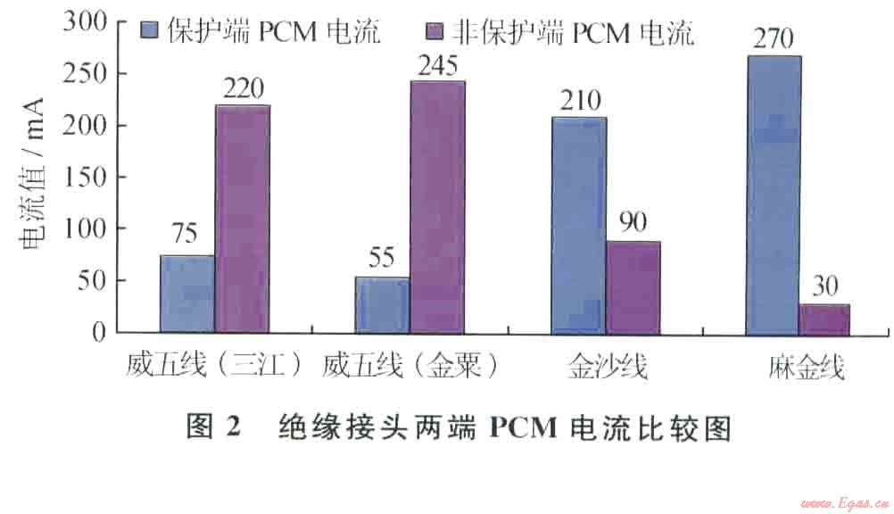 采用RD PCM埋地管線外防腐層檢測儀測試絕緣接頭的漏電比率。將RD PCM儀器的發(fā)射機架設(shè)在絕緣接頭保護端,輸送300mA的PCM電流,利用接收機檢測出有很大部分PCM電流經(jīng)絕緣接頭流人非保護端(如圖2中威五線(金粟)絕緣接頭兩端的PCM電流顯示絕大部分PCM電流流入了非保護一端的站場)。