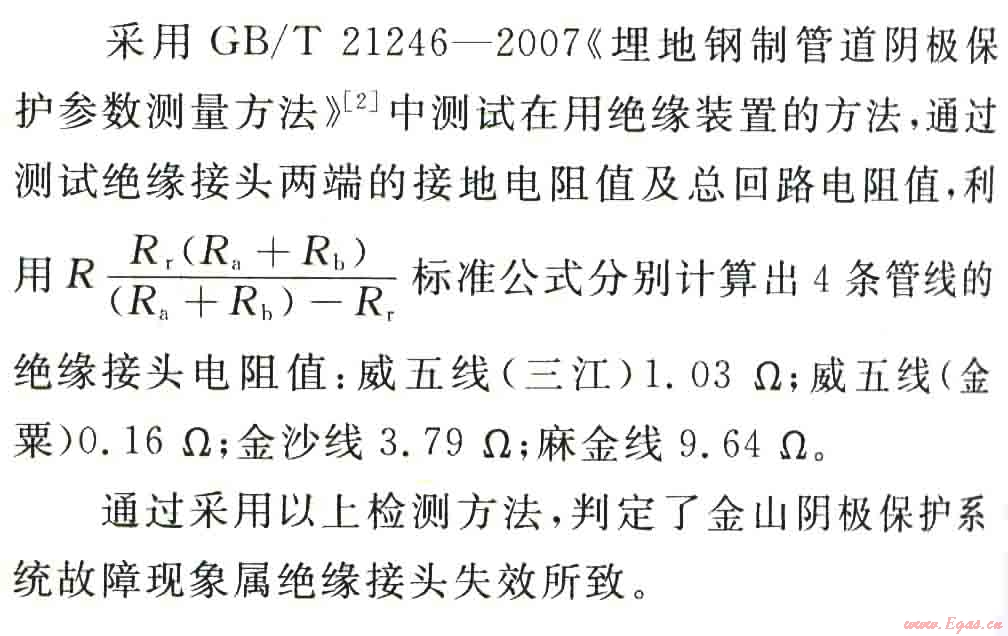 絕緣裝置出廠前通過了嚴格的絕緣檢測試驗,安裝后檢測比較困難。絕緣裝置會受到安裝位置、管輸介質(zhì)、管道外圍金屬構(gòu)筑物等因素的影響,導(dǎo)致陰極保護電流增大,管道保護效率降低等絕緣裝置失效的現(xiàn)象。下面以中國石油西南油氣田公司金山輸氣站絕緣裝置失效為例進行檢測分析。