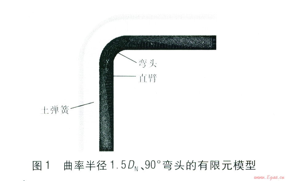 在Pro/Engineer軟件中建立橢圓彎頭模型,并通過(guò)數(shù)據(jù)無(wú)縫連接的方法將模型導(dǎo)入ANSYS軟件中。在ANSYS軟件中對(duì)彎頭進(jìn)行網(wǎng)格劃分,并施加彈簧一阻尼器單元,然后設(shè)置彎頭和土彈簧的參數(shù),再施加荷載進(jìn)行求解。對(duì)彎頭的應(yīng)力有限元求解采用第四強(qiáng)度理論(形狀改變比能理論),第四強(qiáng)度理論認(rèn)為形狀改變比能是引起材料屈服破壞的主要因素,無(wú)論何種應(yīng)力狀態(tài),只要構(gòu)件內(nèi)一點(diǎn)處的形狀改變比能達(dá)到單向應(yīng)力狀態(tài)下的極限,材料就要發(fā)生屈服破壞。由米塞斯(Mises)公式[8]65計(jì)算當(dāng)量應(yīng)力??紤]到彎頭兩端直臂過(guò)長(zhǎng)易降低軟件的運(yùn)算速度,因此建模時(shí)彎頭兩端直臂長(zhǎng)度只取5 m,熱伸長(zhǎng)量均由位移荷載代替,將位移荷載施加到直臂兩端面上。采用20節(jié)點(diǎn)的Solid95實(shí)體單元?jiǎng)澐謴濐^與直臂,彈簧-阻尼器單元COMBINl4用于模擬管-土相互作用下的土彈簧[10],對(duì)彎頭和直臂全部采用自由劃分后形成的網(wǎng)格方式[10]。曲率半徑1.5DN(DN為公稱直徑)、90。彎頭的有限元模型見(jiàn)圖1。