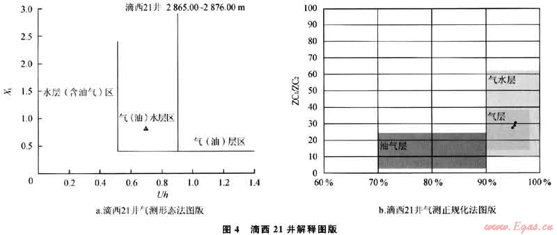 在2867.62~2871.97m井段取心,獲熒光級(jí)巖心2.32m,出筒時(shí)油氣味淡,巖心表面及氣孔局部一普遍冒氣,噴照熒光10%,暗黃色,弱發(fā)光,系列對(duì)比11級(jí),乳黃色,氣測(cè)全烴由0.386 9%↑3.5623%,組分出至C5;氣測(cè)正規(guī)化圖版解釋為氣層(圖4-a),氣測(cè)形態(tài)法解釋為氣水同層(圖4-b)。后效在2867.62m有含水跡象,錄井解釋為氣水同層。后在井段2865.O0~2876.00m試油,日產(chǎn)油0.12t、氣5060m3、水2.65m3,試油結(jié)論為氣水同層。